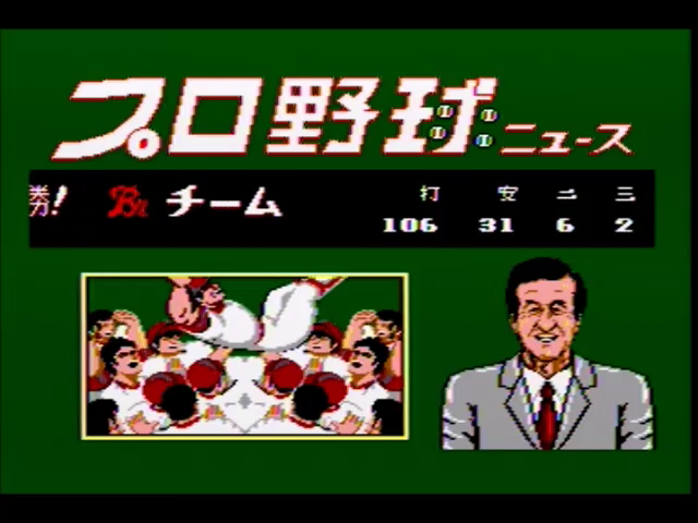 ペナントレースで5連勝すると日本シリーズへ。日本シリーズは、3戦中2勝すれば優勝となります。優勝すると、往年のプロ野球ニュース(風)の画面に。キャスターはもちろん懐かしの佐々木信也(風)です。